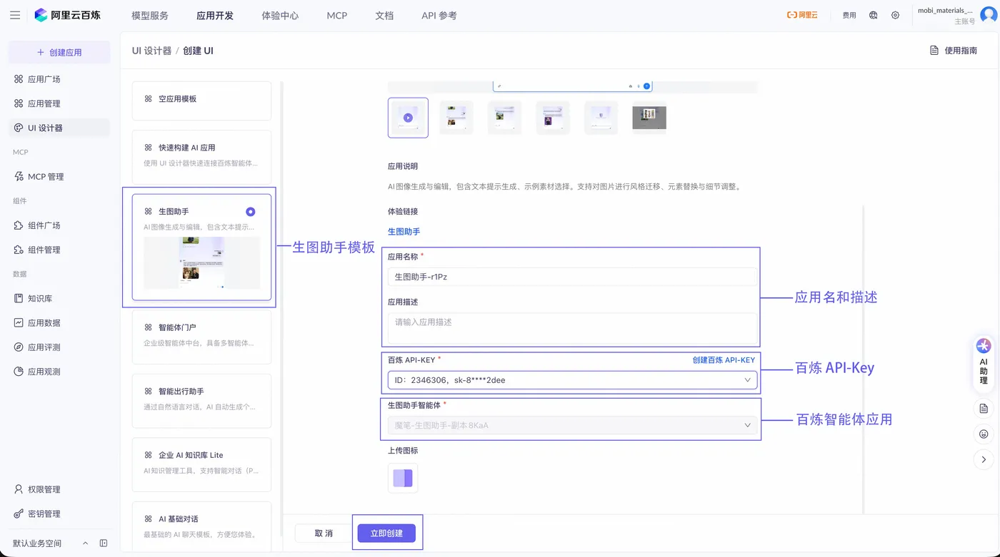 阿里云百炼 UI 设计器 是在阿里云百炼智能体开发的基础上,提供了 UI 搭建、资源集成、账号权限管理、多端发布等能力,助力 AI 应用实现快速落地,解决 AI 应用开发 “最后一公里” 难题。