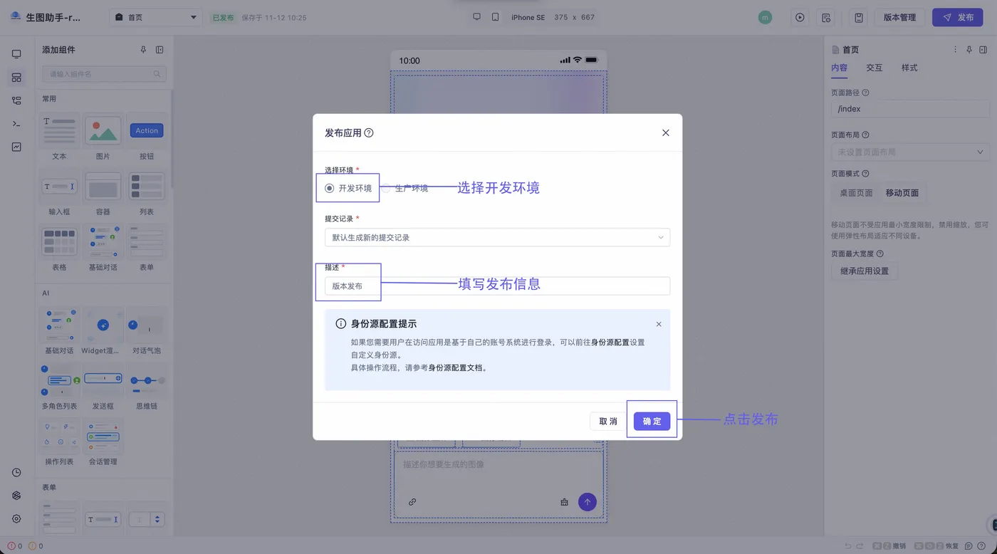 测试无误后,点击发布按钮,即可将应用发布到开发环境。