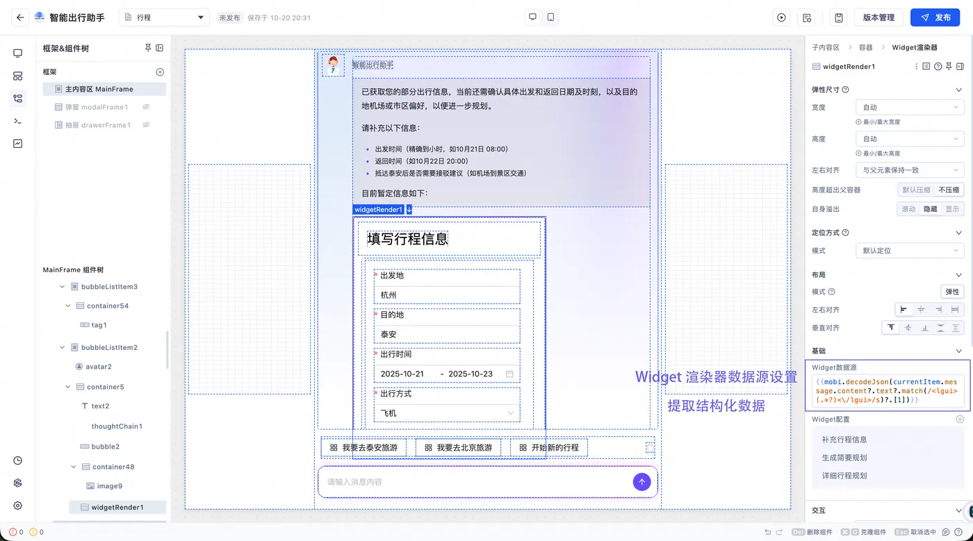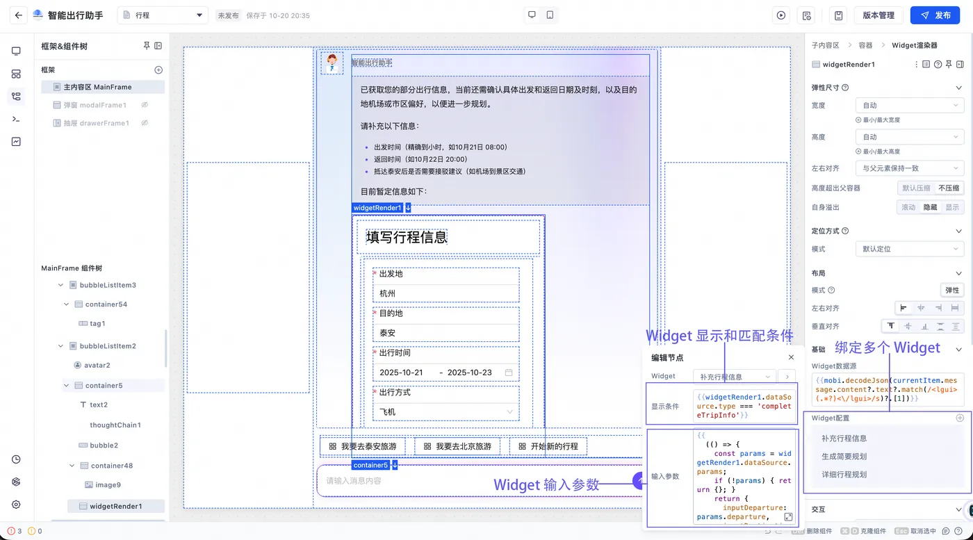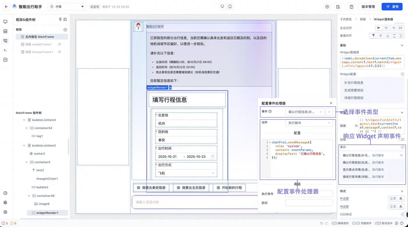 如果要进一步让对话交互突破纯文本 / Markdown的限制,呈现更丰富的 GUI 交互与可操作功能,可以结合自定义 Widget 能力进行扩展。