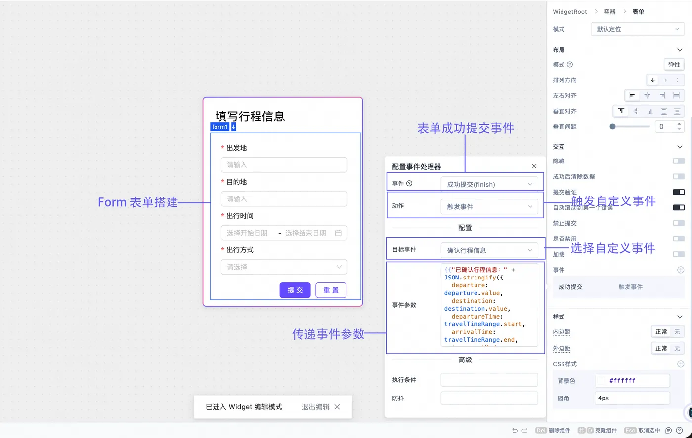 - 为这些事件配置对应的处理器,实现 Widget 与应用的通信、交互与联动