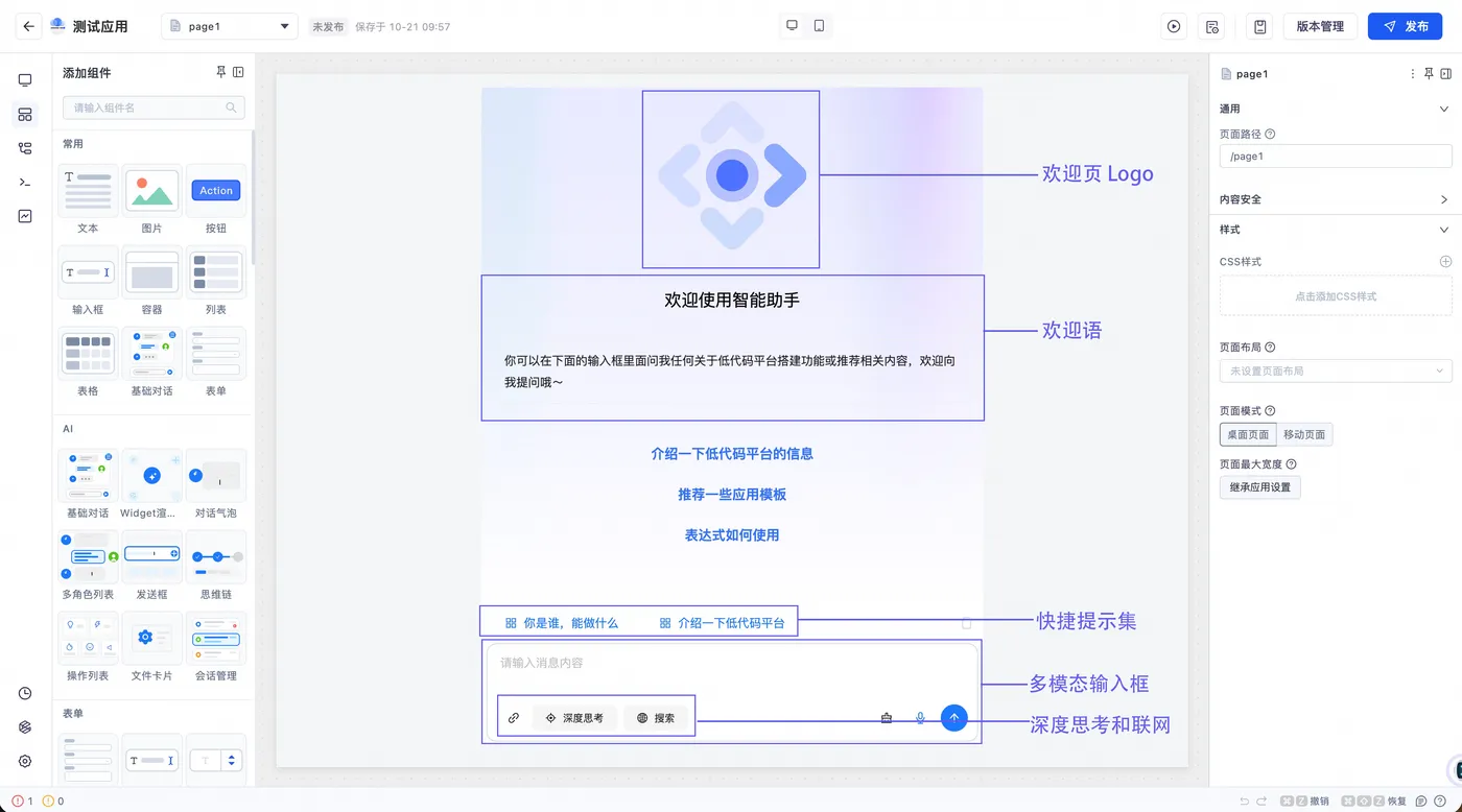 点击创建进入应用设计器,在这里可以实时体验并测试应用功能。