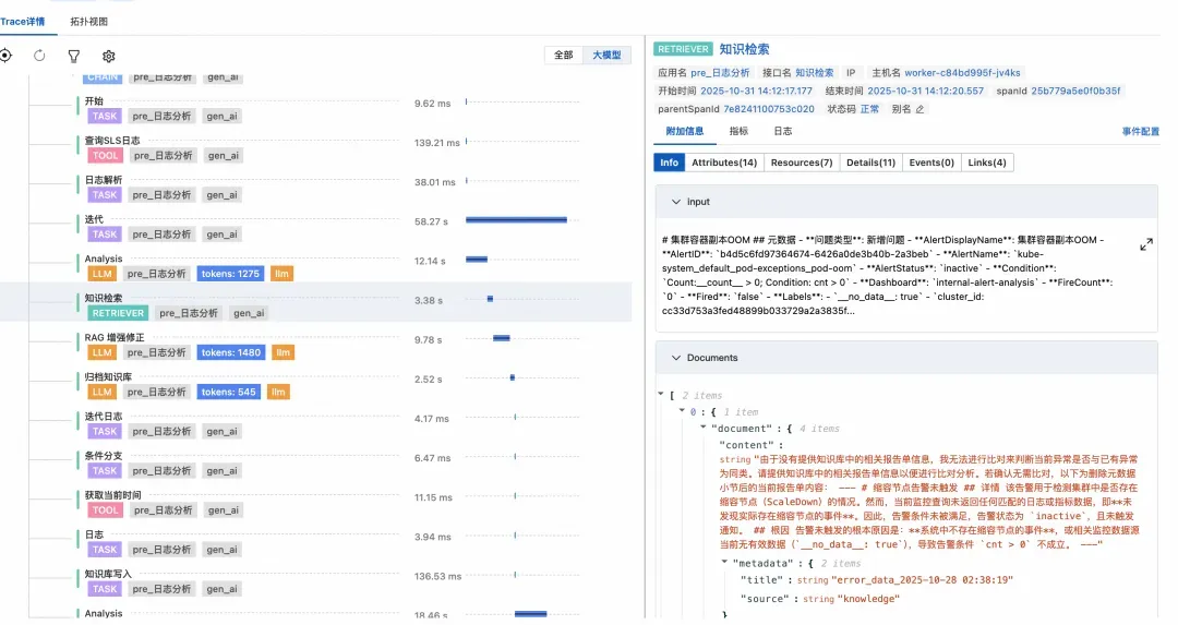 Retriever 节点会采集 查询语句、召回片段、关联文档元数据、embbeding 评分等信息。
