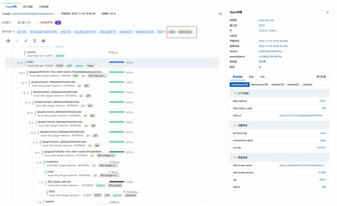 可以看到 dify 执行引擎(local-dify-api)发起了对 dify 插件引擎(local-dify-plugin-daemon)的POST 调用,插件引擎调用插件运行时(local-dify-plugin-daemon_plugin_cms_0.0.1)并转发请求给 SLS 服务端口。整个链路上耗时最长的是 dify_plugin_execute,这是插件运行时内部的入口方法,我们正是在此处注入了故障模拟的慢调用。