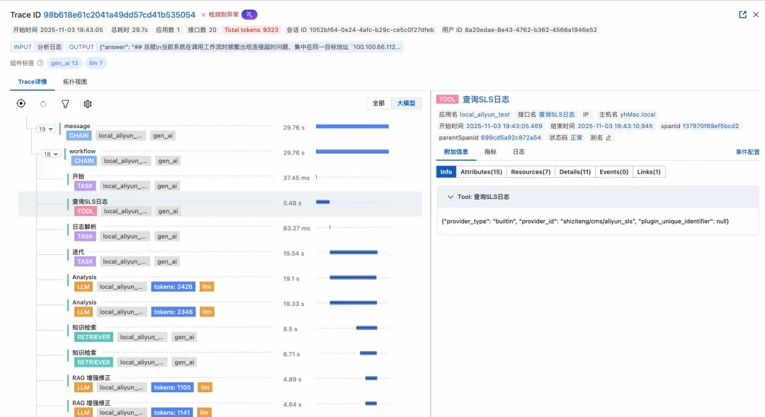 如图示例中“查询SLS日志”是一个 Dify 插件,正常调用只需 200 ms,但在这个 Trace 中却有 5 s多的慢调用。仅看 LLM Trace 或 Dify 执行日志,无法判断慢请求是因为 Dify-Api 引擎、Dify-Plugin-Daemon 插件引擎、Dify-Plugin 运行时或者 SLS 日志服务本身导致的。