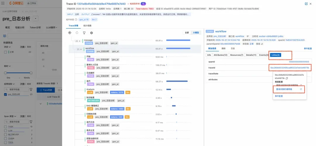 如果对应的 Workflow 开启了云监控追踪,在 span 附加信息的 Links 页签可以看到关联的 LLM Trace Id,点击“查询关联的调用链”可跳转到相应 LLM Trace。