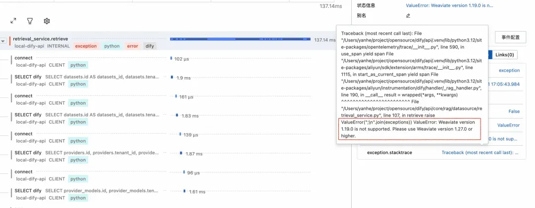 在错误 Span 的 Details 和 Events 中,可以看到错误信息和异常堆栈。并定位到根因是 Weaviate 向量存储配置引起的问题。
