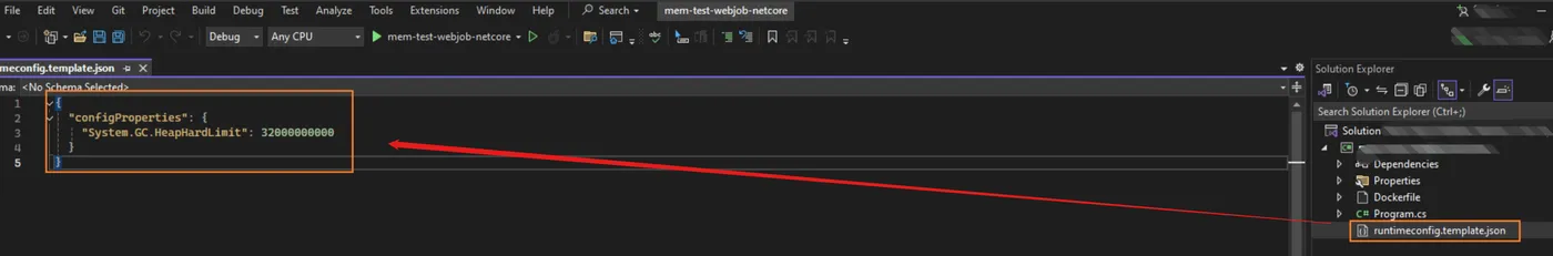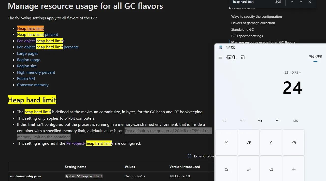 当然,知道这个限制之后,就可以通过配置去修改它,比如通过配置 runtimeconfig.json 文件,设置 System.GC.HeapHardLimitPercent : 96 或者 System.GC.HeapHardLimit : 32,000,000,000