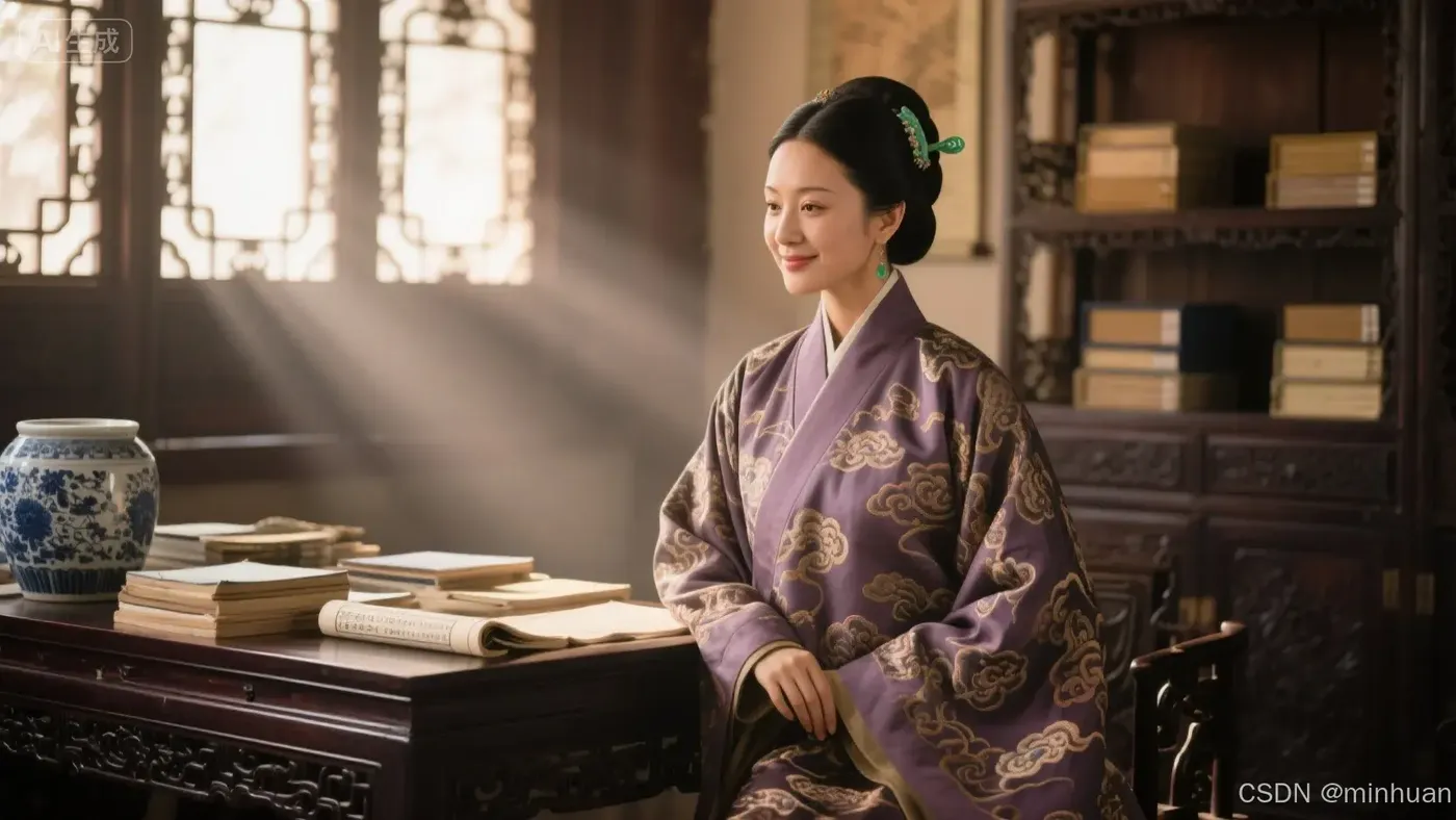 (绝美华人女子:1.2),(年约三十,仪态万方,神情自信从容,有一种不怒自威的沉静气场:1.3),(身处明代豪门书斋内:1.2),(身着极其精美的【缂丝】长袍,上有含蓄的【云纹】暗绣:1.4),(发髻仅簪一枚简约却价值连城的【翡翠】玉簪:1.3),(正立于紫檀木书案旁,案上散落古籍与一件【青花瓷】卷缸:1.1),(柔和的【昼光】穿过雕花窗棂,在空气中形成【丁达尔效应】,照亮浮尘:1.3),(目光凝视画外,带着一丝洞悉一切、若有似无的微笑:1.2),(捕捉一种【静默的力量感】与【承袭的优雅】:1.2),照片级真实,皮肤肌理,织物纹理,体积光