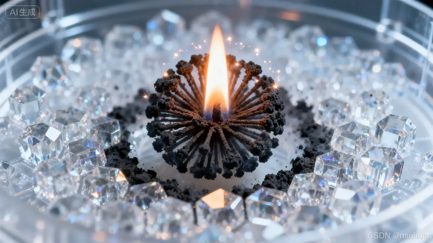 "在真空环境中燃烧的蜡烛,火焰呈球型辐射,碳烟形成规则晶体结构"