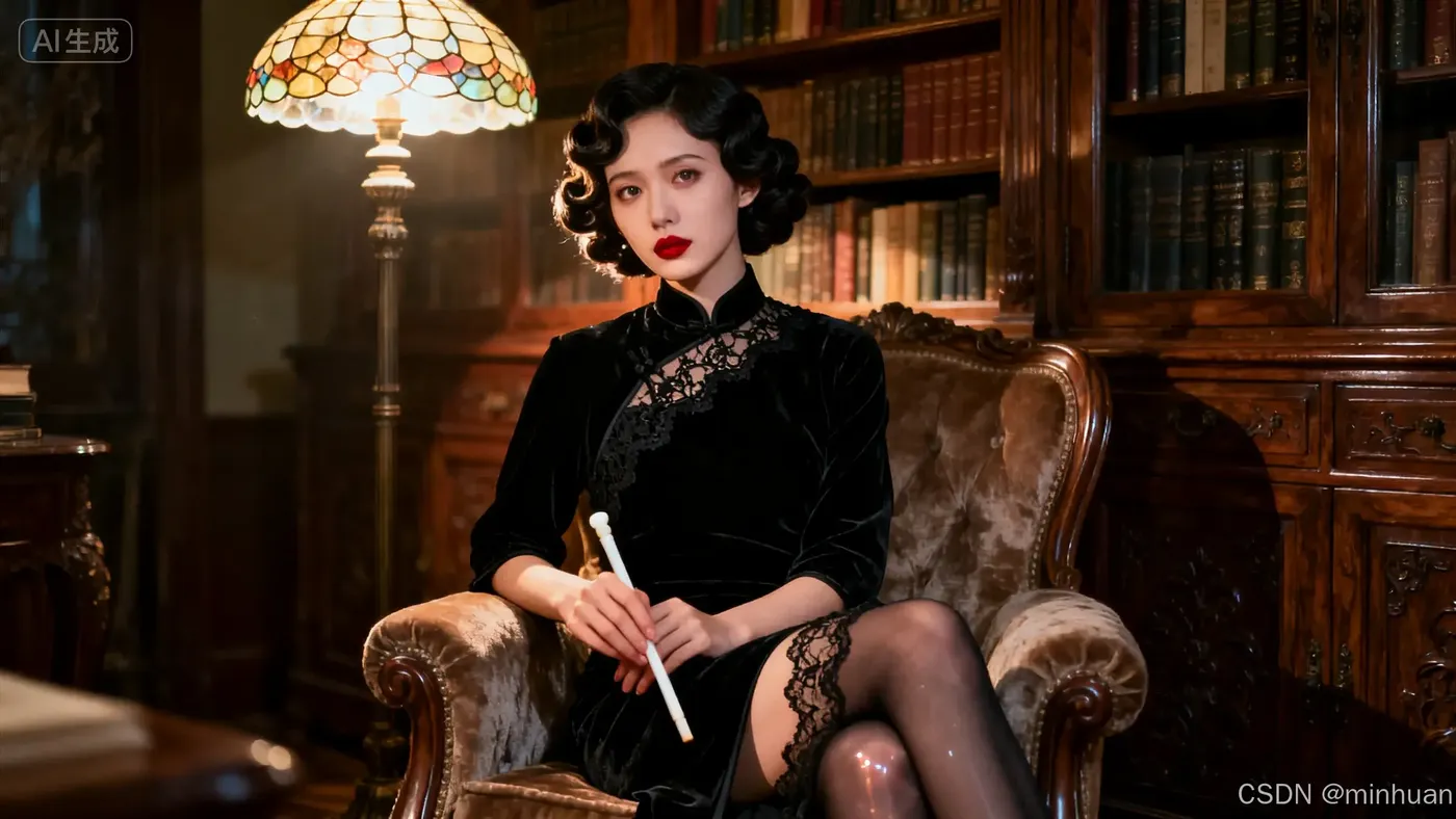 (超高清8K特写:1.3),(聚焦于一位容颜绝世、气质如兰的民国千金小姐的面庞:1.4),(她是受过西式教育的大家闺秀,眼神聪慧澄澈,带着一丝不易察觉的叛逆与忧伤:1.5),(她梳着精致的复古手推波纹发型,妆容是古典的绛唇鹅蛋脸,肌肤胜雪,肤质细腻如瓷:1.3),(【环境设定】:她身处一间【中西合璧的奢华书房】,身后是中式梨花木书柜与西式琉璃台灯,暗示其身份:1.1) (【服装与元素的叙事化融合】: 她身穿一件【墨黑色】的【丝绒材质】改良式旗袍裙,整体剪裁保留东方廓形:1.2) 旗袍的【领口】和【斜襟】处,镶嵌着极其精美的【欧洲进口黑色丝边】,作为低调的装饰,而非主体:1.4) 镜头下移,捕捉到她【优雅地交叠坐在一张欧式天鹅绒椅凳上】,一条穿着【复古哑光玻璃丝袜】的腿【自然地微微伸出】,裙摆开衩处【若隐若现】地露出腿部的优美线条:1.6) (【光影与氛围】: 一束【温暖的台灯光】从侧上方打来,如同伦勃朗光,照亮她绝美的半张脸,在另一侧脸上投下【细腻的阴影】,完美勾勒其面部轮廓:1.5)。光线同时在她手中的【白玉烟杆】和裙摆的蕾丝上产生【柔和的高光】,突出其质感。氛围朦胧,怀旧,充满故事感。