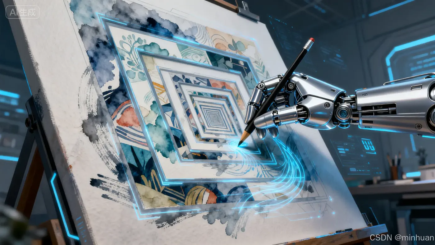 "AI正在绘制本提示词的瞬间,机械手臂握笔在数字画布上创作,画中画形成无限递归,每个嵌套层采用不同的艺术风格"