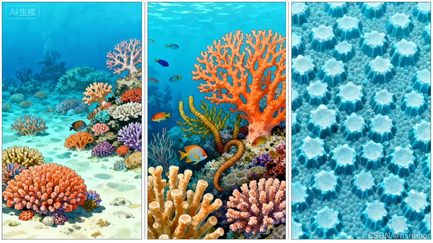"宏观视角看珊瑚礁,中观视角显示共生系统,微观视角展示碳酸钙晶体结构"