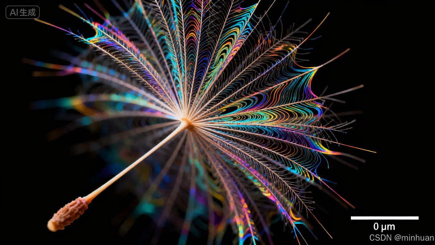 (扫描电子显微镜成像下的蒲公英种子超微结构:1.4),(假色处理显示空气动力学流场 patterns:1.3),(采用景深合并技术呈现全焦点清晰度:1.2),(右下角包含精准的微米级分辨率标记尺:1.1),(种子绒毛呈现虹彩干涉色),(背景为实验室黑色背景),科学可视化,科研论文插图风格,超高细节,8K分辨率