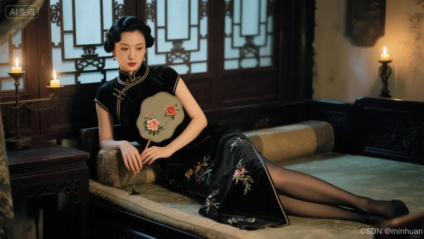 (绝美的晚清闺阁仕女:1.3),(慵懒地倚在雕花窗棂旁的贵妃榻上:1.2),身着墨色苏绣旗袍,(半透的墨色绢丝长袜勾勒出柔美腿线:1.4),旗袍开衩处若隐若现,手持一柄团扇,眼角有一抹秾艳的花钿,眼神疏离哀婉。环境是(烛火摇曳的中式古宅:1.1),(氤氲的光影:1.3),柔光滤镜,空气中可见浮尘,(仿胶片质感,色彩浓郁如王家卫电影:1.2),皮肤肌理,高清,8K,细节精良