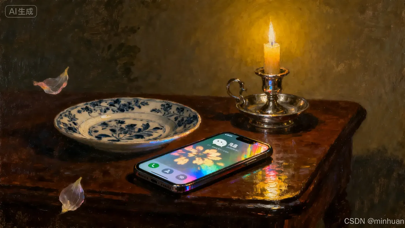"17世纪荷兰静物画中的智能手机,油画颜料质感与玻璃屏幕折射并存,烛光照亮下的微信界面,花瓣投影在显示屏上"