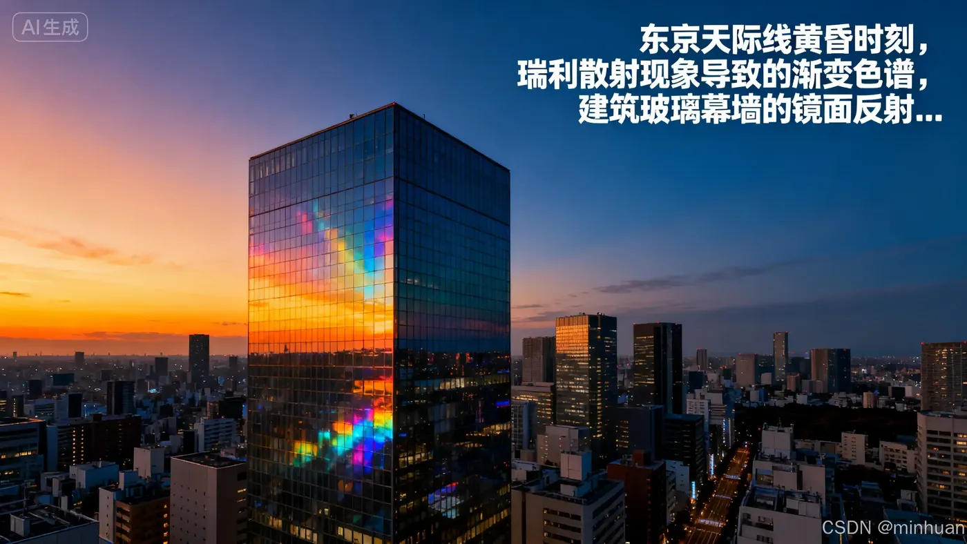 专业版本:"东京天际线黄昏时刻,瑞利散射现象导致的渐变色谱,建筑玻璃幕墙的镜面反射,各向异性材质对低角度光线的响应"