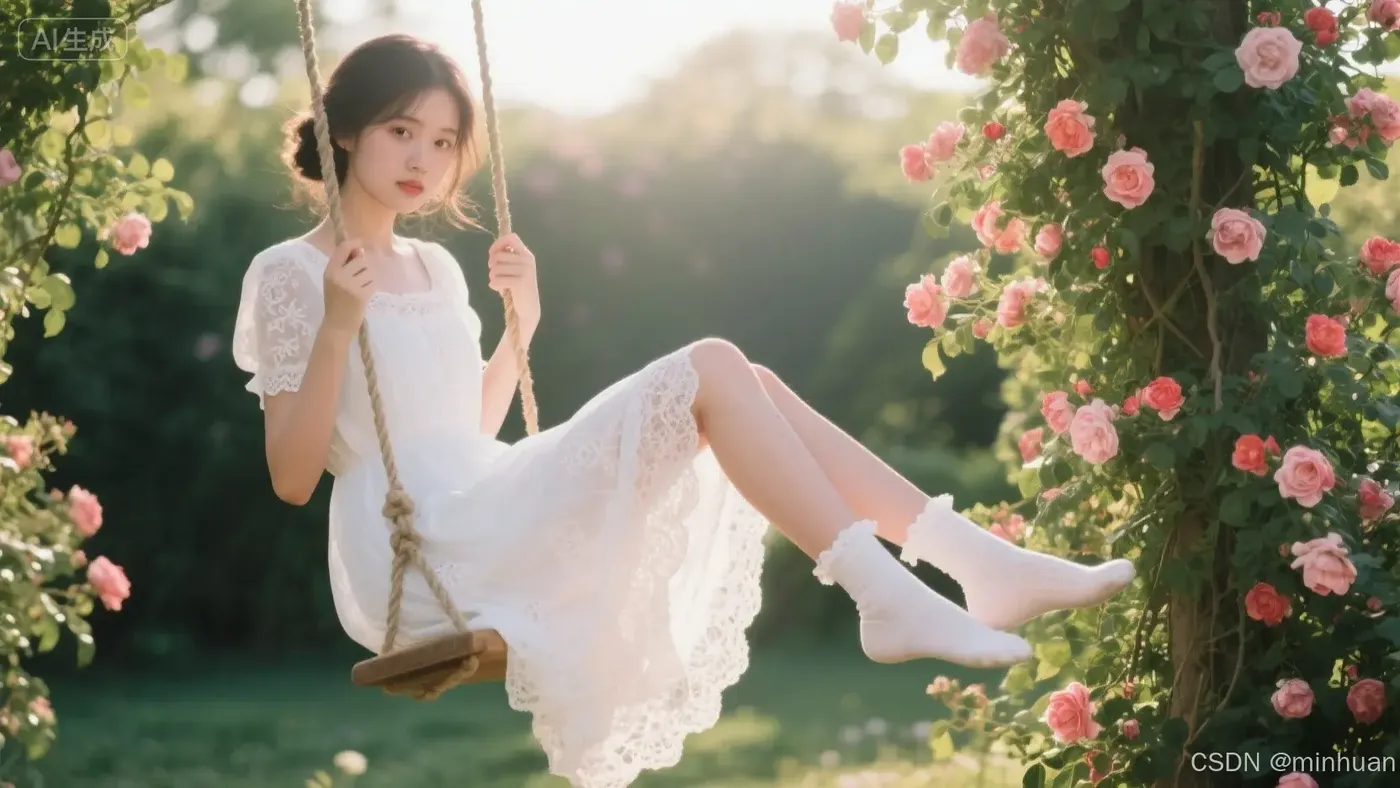 (1位颜值惊人的年轻少女,约20岁,面容纯洁无瑕,眼神【懵懂又好奇】,带着一抹羞涩的红晕:1.4),(身处一间【阳光充沛】的【复古乡村花园】中,周围是盛开的蔷薇花:1.2),(她【赤足坐在秋千上】,一条穿着【白色丝边短袜】的腿【自然弯曲】,另一条腿【纤细修长】的腿【天真无邪地向前伸展】,(身穿一件【维多利亚风格】的【白色蕾丝刺绣】连衣裙,裙摆较短,材质轻薄透光,符合其清纯气质:1.4),(【下午四点的阳光】穿过藤蔓,形成【柔和的光斑】洒在她身上,营造出一种【朦胧的、空气感】的氛围:1.4),(仿胶片质感,柔光滤镜,色彩清新柔和,肤质如珍珠般细腻光滑,充满青春活力)