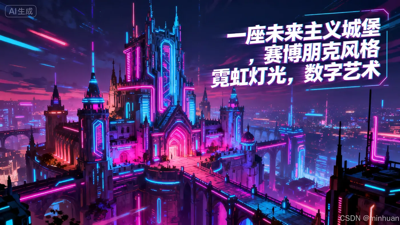 对比提示词:"一座未来主义城堡,赛博朋克风格,霓虹灯光,数字艺术"