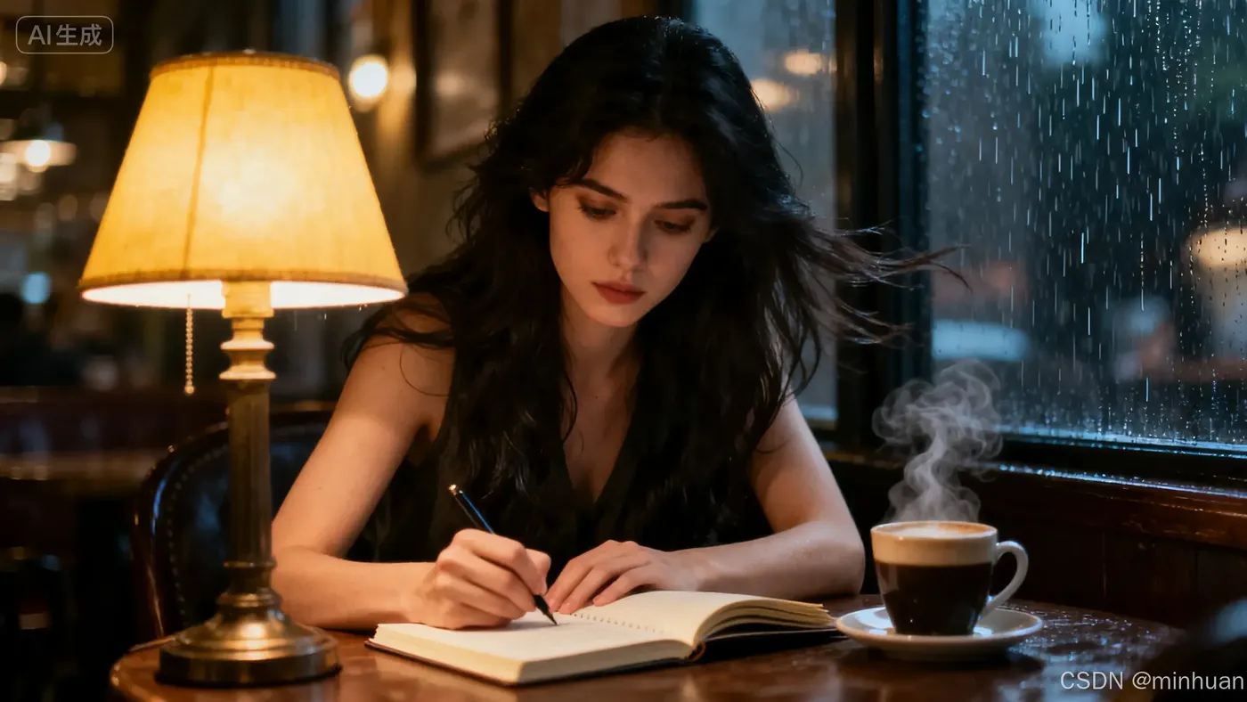 一位年轻的作家,坐在一间充满复古氛围的咖啡馆里,温暖的台灯照亮了他的书桌,手边放着一杯冒着热气的咖啡,窗外是淅淅沥沥的雨夜。他正专注地在笔记本上书写,表情沉思。柔光,电影感,照片级真实,高细节,氛围感 - 负面提示词:
