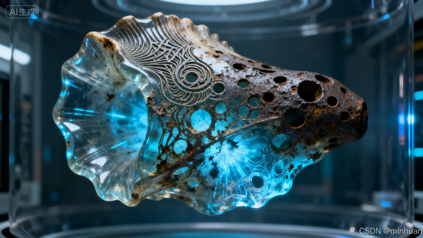 (一件正在经历【相变过程】的【生物角质】雕塑:1.5),其表面呈现【激光蚀刻】的精密纹路与【百年腐蚀】留下的孔洞并存的奇异状态,材质同时具有【琉璃】般的通透性与【铸铁】的厚重感,散发出幽蓝色的【切伦科夫辐射】光芒,整体【悬浮】于真空环境中,捕捉其【10^-3秒】前的【爆破瞬间】所凝固的永恒态,【次表面散射】效应使得内部结构若隐若现,风格融合了【新艺术运动】的曲线与【22世纪】的科幻感,8K,超高细节,实验室记录影像