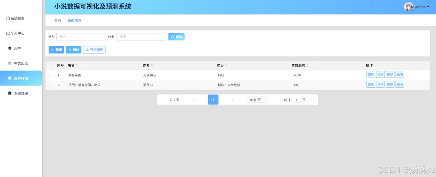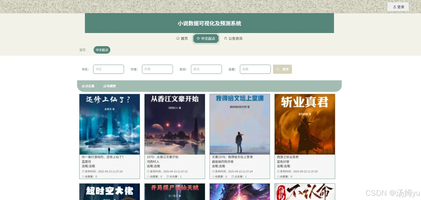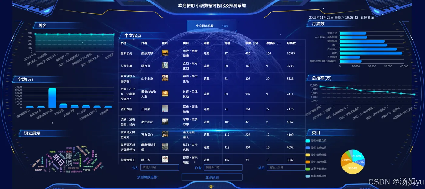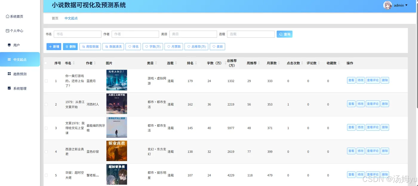 在互联网迅猛发展的当下,网络小说已成为人们日常娱乐与阅读的重要构成部分。各大网络文学平台蓬勃兴起,产生了海量的小说数据,涵盖作品信息、读者行为、市场热度等多维度内容。然而,面对如此庞大的数据量,传统的人工分析方法不仅效率低下,且难以全面、深入地挖掘数据背后的潜在价值,无法满足行业快速发展的需求。从数据获取层面看,小说数据分散于多个平台,格式多样,整合难度大,导致数据获取碎片化,难以形成全面、系统的数据集。在数据分析方面,现有分析多停留在表面统计,如仅统计阅读量、点击量等,缺乏对用户偏好、小说热度变化趋势等深层次信息的挖掘,难以精准把握市场动态和用户需求。在数据可视化领域,传统方式多以静态图表呈现,交互性差,用户无法直观、动态地探索数据,难以从中获取有价值的信息。同时,在小说热度预测方面,缺乏科学有效的算法支撑,预测精度低,无法为平台运营策略制定和用户个性化推荐提供可靠依据。Python凭借其丰富的数据处理库和强大的机器学习算法,为解决上述问题提供了有力支持。其大数据处理能力可高效整合多源异构数据,数据可视化库能实现动态、交互式可视化展示,机器学习算法则可构建精准的预测模型。因此,开展基于Python大数据的小说数据可视化及预测系统研究,对于提升网络文学行业的数据分析水平、优化运营策略、增强用户体验具有重要意义。