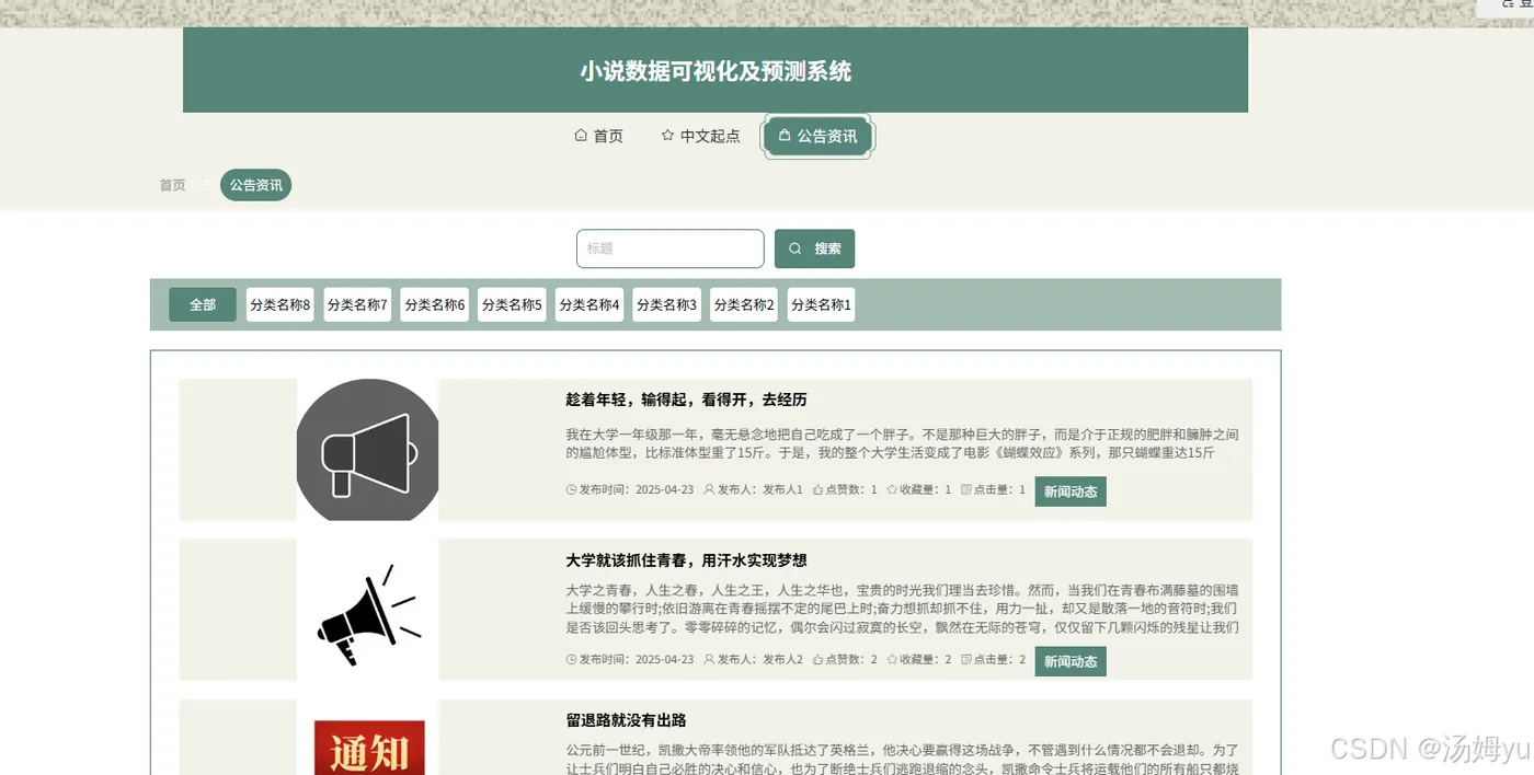在网络文学竞争激烈的环境下,精准运营是平台脱颖而出的关键。基于Python大数据构建的小说数据可视化及预测系统,能整合多平台海量数据,通过可视化直观呈现小说热度趋势、读者地域分布、阅读时段偏好等关键信息。平台可据此优化作品推荐策略,将热门小说精准推送给目标用户,提高用户点击率和阅读时长;还能根据不同地区读者的喜好,调整区域推广资源分配,提升运营效率。同时,预测系统可提前预估小说未来热度,帮助平台合理规划资源,如提前安排热门小说的版权运营、衍生开发等,实现资源最大化利用。