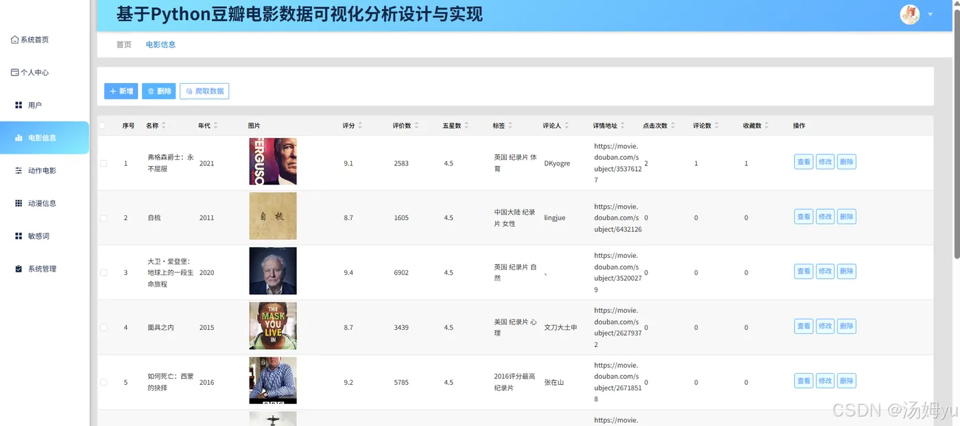 在当今数字化时代,电影产业蓬勃发展,全球电影市场年票房收入持续增长。据统计,2023 年全球电影票房总收入达到数百亿美元,电影数量也呈爆发式增长,每年有数千部电影在全球各大院线上映。然而,如此庞大的电影数据蕴含着丰富的信息,但缺乏有效的分析手段,使得电影从业者、投资者和观众难以从中获取有价值的知识。传统的电影分析方法主要依赖人工统计和简单图表展示,效率低下且难以挖掘数据背后的深层次规律。例如,电影制片方在策划新项目时,需要了解不同类型电影的市场表现、观众偏好以及票房与成本之间的关系,但仅靠传统方法很难全面准确地获取这些信息。此外,观众在众多电影中选择观影时,也缺乏直观的方式了解电影的质量、口碑和热度。Python 作为一种功能强大且易于使用的编程语言,在大数据处理和可视化领域具有显著优势。它拥有丰富的库和框架,如 Pandas 用于数据清洗和预处理,NumPy 用于数值计算,Matplotlib 和 Seaborn 用于数据可视化,Scikit - learn 用于机器学习分析等。这些工具能够帮助我们高效地处理海量的电影数据,并通过可视化手段直观地展示分析结果。基于 Python 大数据的电影分析可视化系统应运而生。该系统可以整合来自多个渠道的电影数据,包括票房数据、观众评分、社交媒体讨论热度、电影类型、导演和演员信息等。通过对这些数据进行深入分析,电影从业者可以更好地把握市场趋势,制定更精准的营销策略;投资者可以根据电影的历史表现和潜在市场价值做出更明智的投资决策;观众也能通过可视化展示更直观地了解电影的综合情况,从而做出更合适的观影选择。