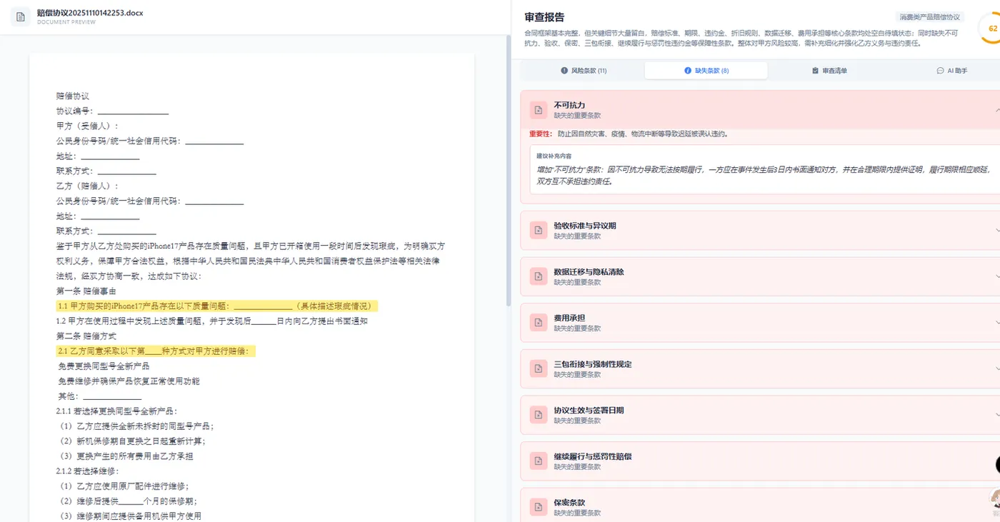 通过BERT-based语义相似度计算(Sentence-BERT),即使条款标题或表述变异(如”保密信息”写成”机密资料”),仍能准确识别条款实质存在性。当检测到缺失时,系统从条款语料库中基于TextRank算法提取最佳实践文本作为补充建议。
