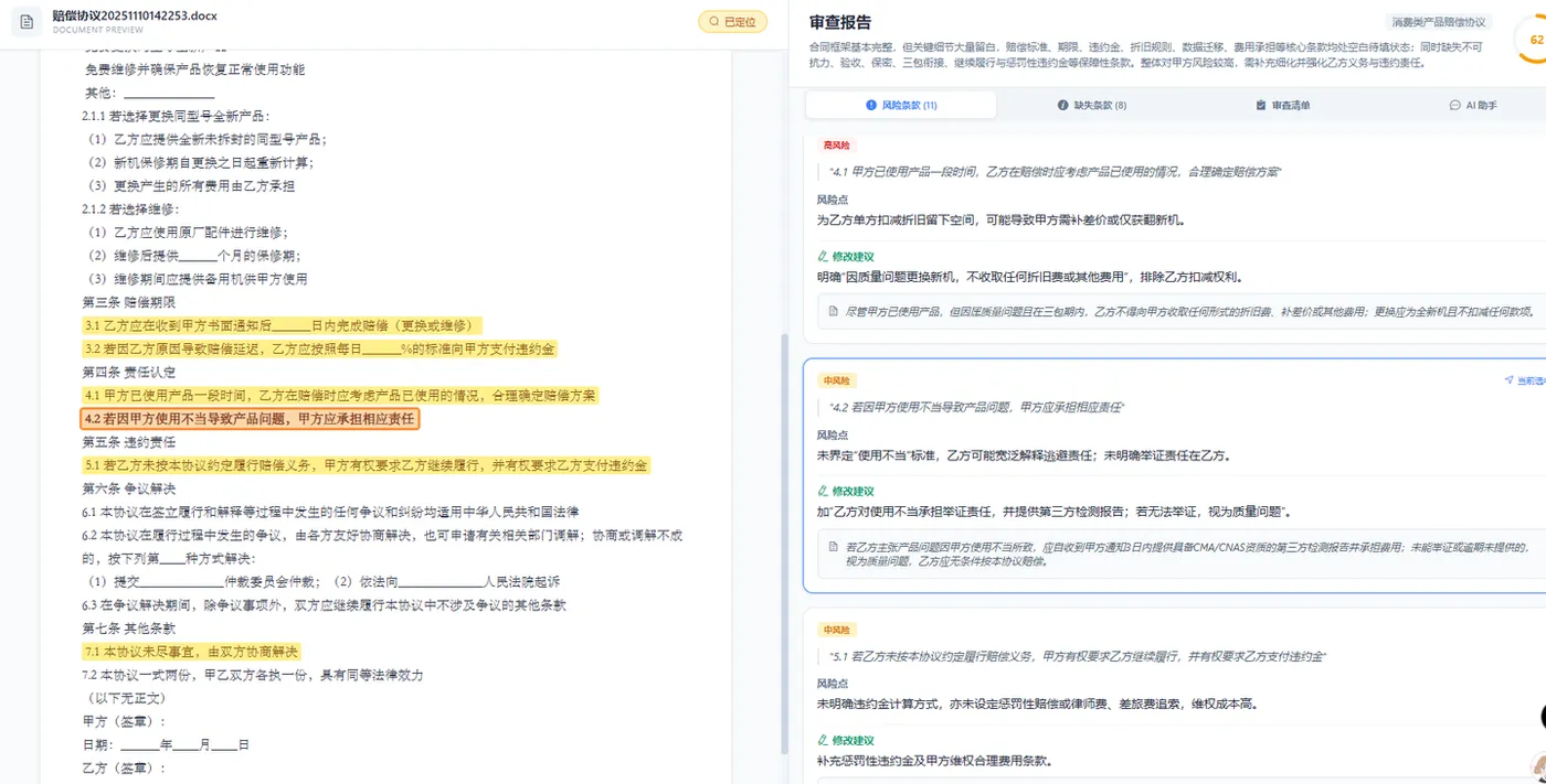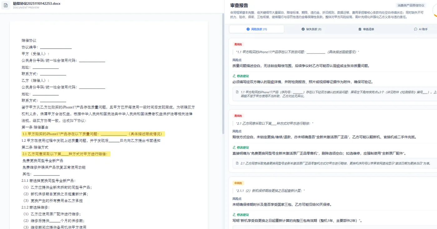 • 多模态审查:支持扫描件、手写批注的OCR与风险识别