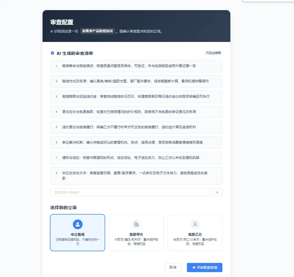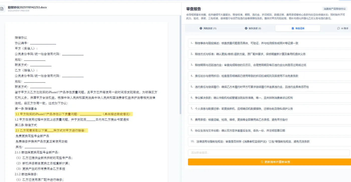 • 清单生成层:采用Chain-of-Thought prompting策略,让LLM生成带优先级权重的审查清单,支持风险等级(高/中/低)、法律依据、审查立场(偏向甲方/乙方/中立)三重维度标注