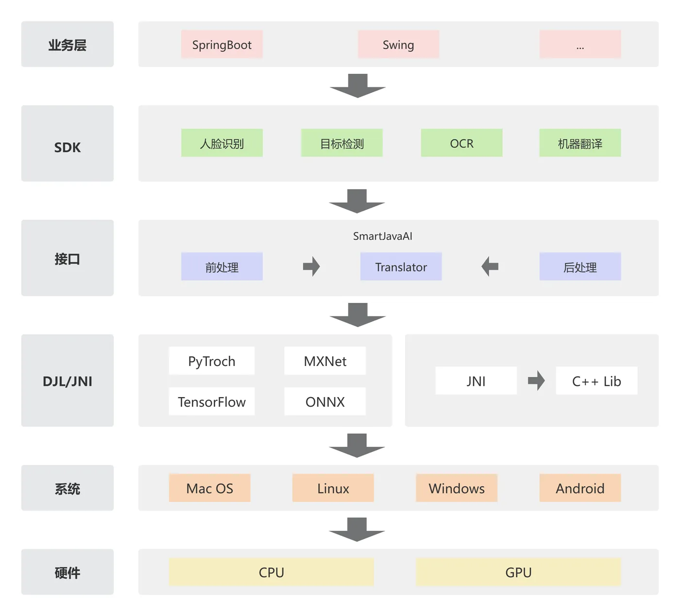 - 引擎层(DJL / JNI):通过 DJL 调用 PyTorch、MXNet、TensorFlow、ONNX 等深度学习引擎;通过 JNI 调用 C++ 算法库。