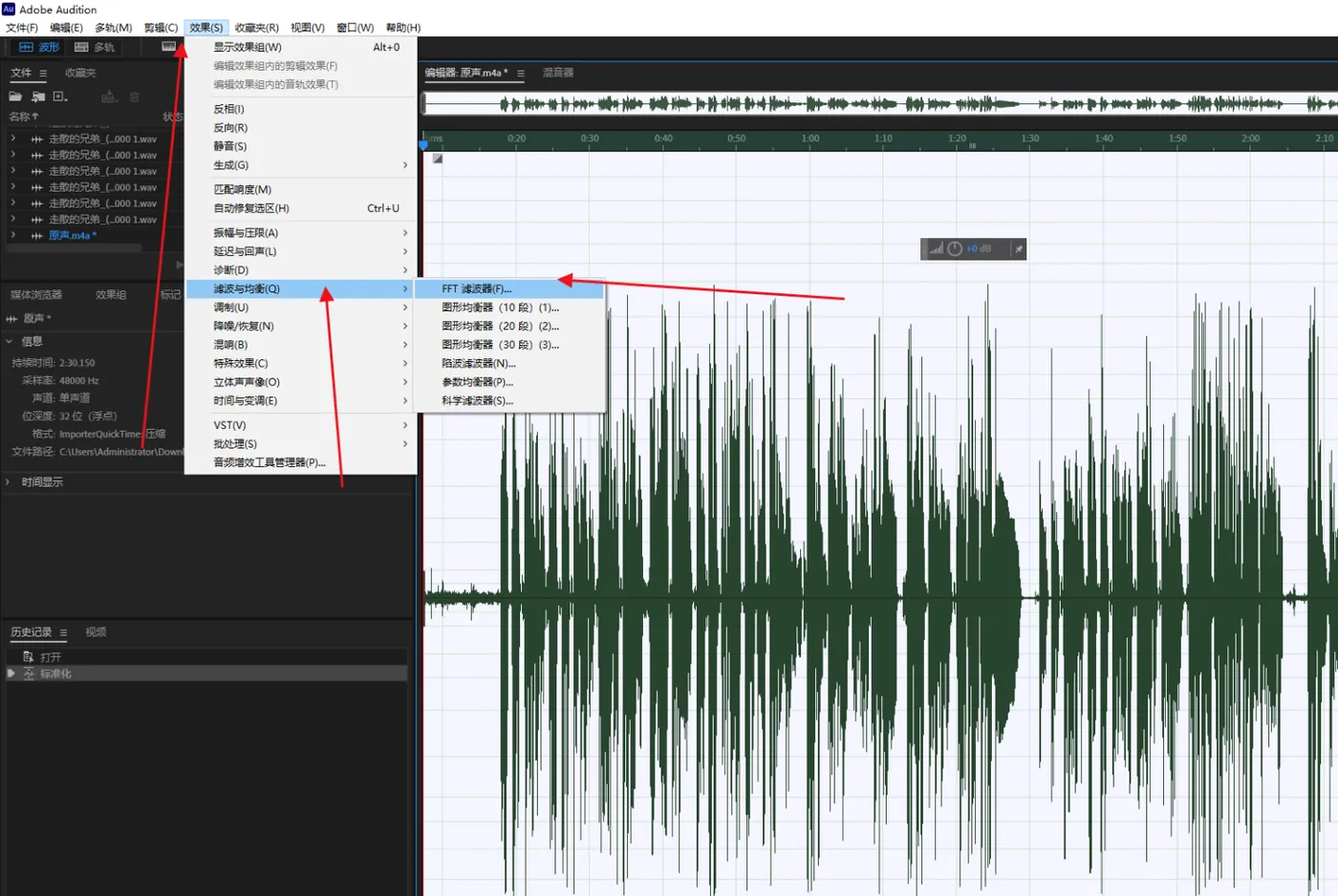 - 打开FFT滤波器:在“效果”菜单 -> “滤波与均衡” -> “FFT滤波器”。