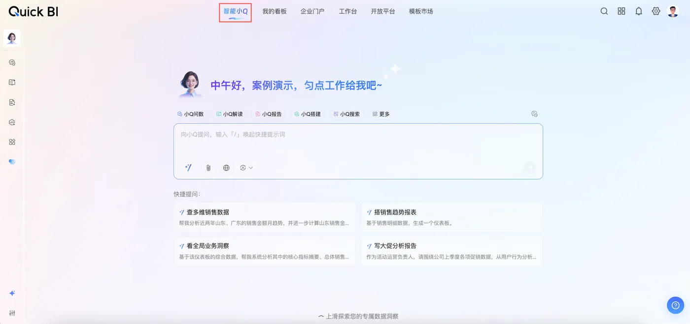 智能化:集成「智能小Q」模块,具备自然语言处理能力,支持智能搭建、智能问数、一键美化等功能。用户通过自然语言交互即可完成数据提问与解读,无需专业设计能力也能生成专业仪表板,深度集成阿里云通义大模型,支持中文自然语言生成SQL和自动化归因分析。