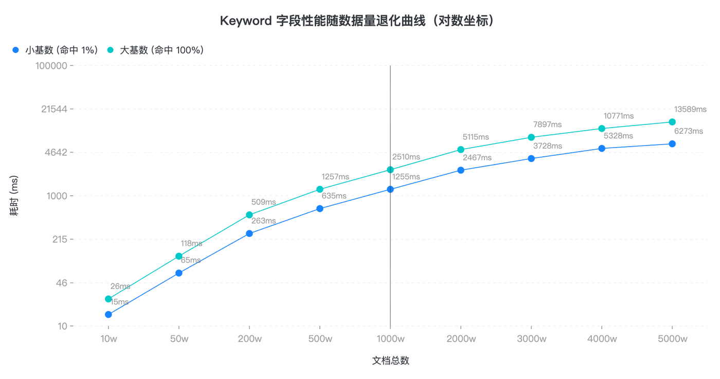 为了让大家直观感受都 keyword 的表现,我们测试了不同数据量下的查询耗时。可见,超过 1000w,即使是小基数,也要 1s+,业务已无法使用。