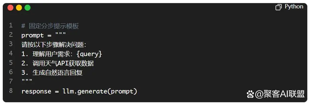 技术特点:依赖人工设计的提示模板(如"分步思考"提示词)和有限决策树,规划流程静态且缺乏灵活性。