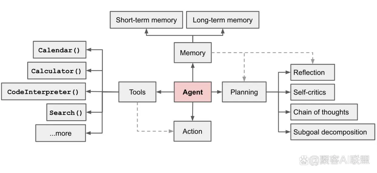 技术驱动:GPT-4 等模型增强了推理能力,思维链(Chain-of-Thought)技术让 Agent 能展示内部思考过程。代表框架如 ReActReflexion
