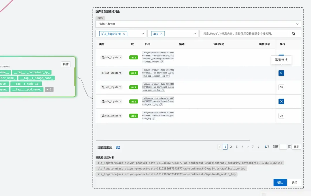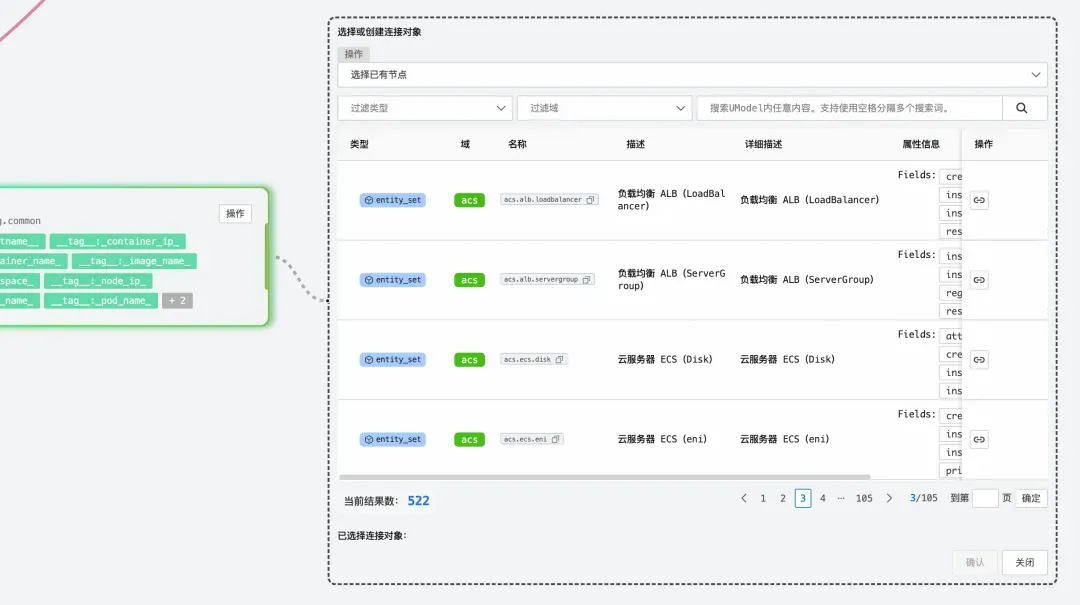 第一种是批量连接模式。当用户从一个节点开始连线,但拖动到画布空白区域时,会弹出一个“选择或创建链接对象的虚拟节点对话框。在这个对话框中,用户可以搜索并选择多个已有的节点,一次性创建多条边。这对于需要将一个节点连接到多个节点的情况特别有用。例如,一个 entity_set 可能需要同时连接到多个 metric_set,使用批量连接模式可以一次性完成所有连接。