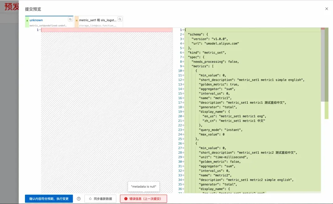在提交预览界面,用户可以点击每个标签页右上角的定位按钮,将对应的元素在画布上进行聚焦定位,这样可以再次确认修改是否正确。如果担心在编辑过程中,Workspace 中的数据被其他用户修改,可以点击“同步最新数据按钮,系统会重新获取最新数据并更新 Diff 视图,这样用户就能看到是否有新的冲突。