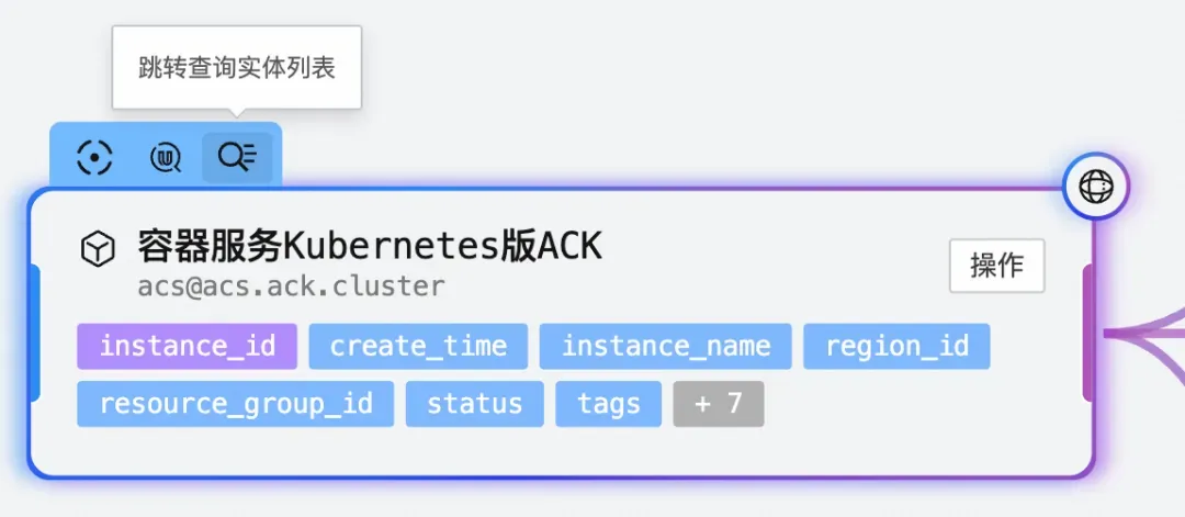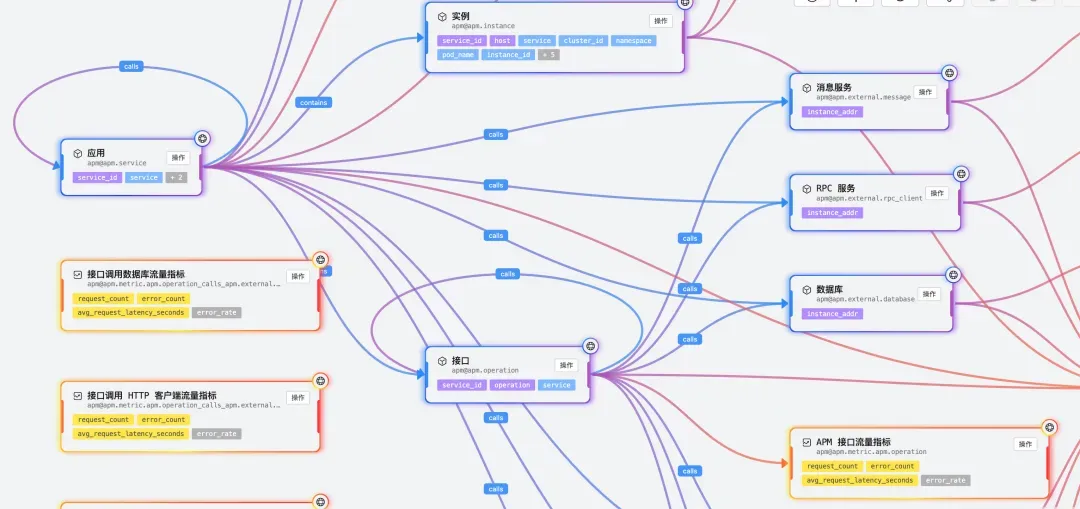 不同类型的节点还有各自的特有操作。例如,entity_set 节点可能有“查询实体列表、“快速查询等操作,metric_set 节点有“分析操作,log_set 节点有“跳转日志查询操作等。这些操作将建模和分析功能无缝集成,让用户可以在建模的同时直接查看和分析数据。