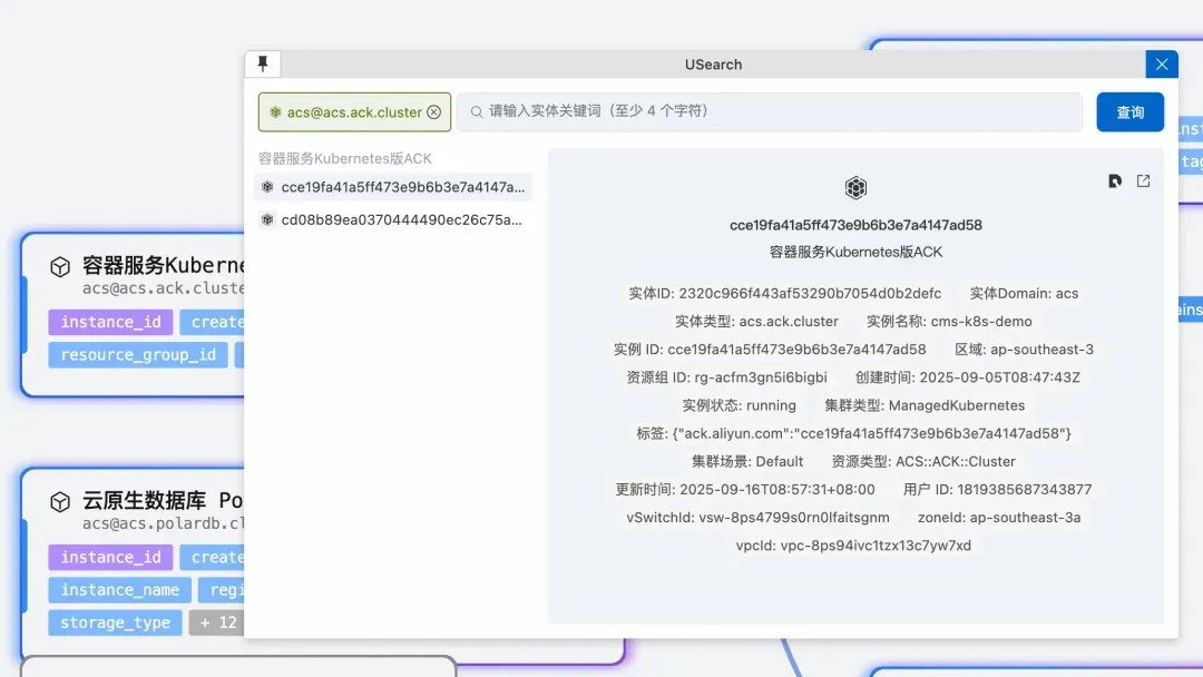 快速查询(Usearch)功能让用户能够直接在画布上查询 entity_set 中包含的实体数据。点击操作菜单中的“快速查询,会打开一个查询面板。在这个面板中,用户可以输入查询条件(基于实体的字段),系统会实时返回匹配的实体列表。查询结果支持进一步筛选和排序,用户可以快速找到感兴趣的实体。