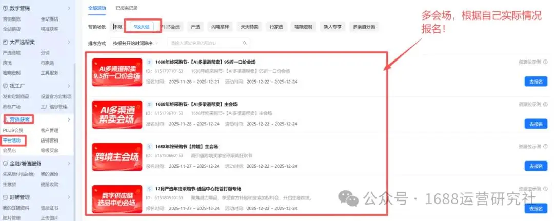 1.1688后台首页-营销获客-平台活动-S级大促,根据需要报名自己的会场即可。