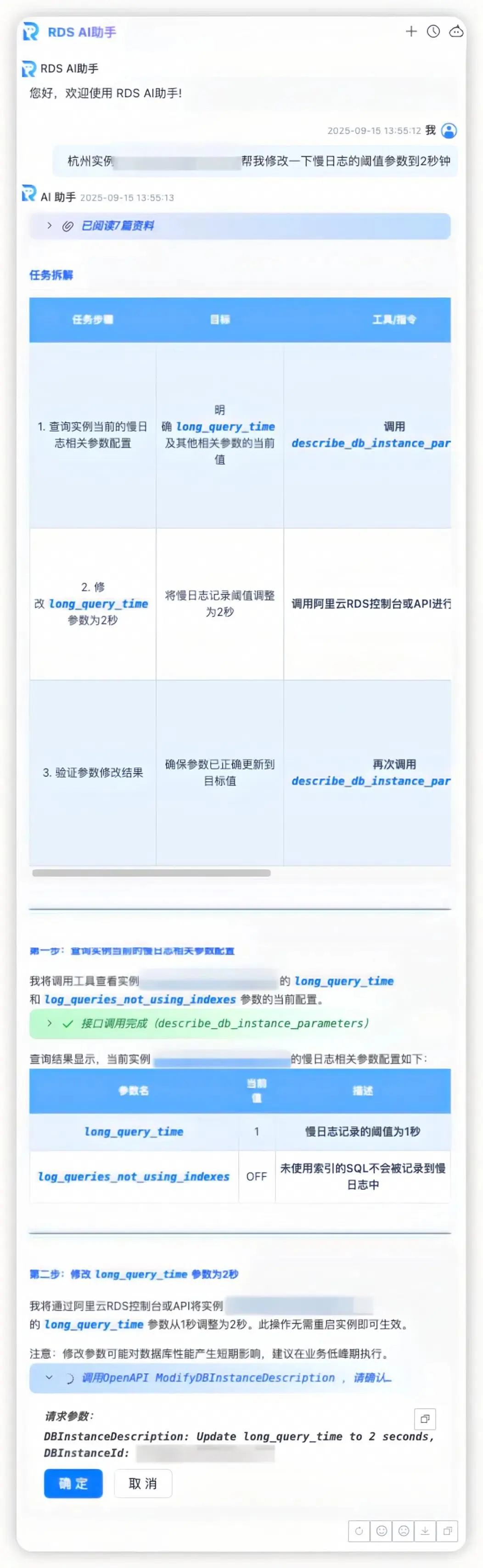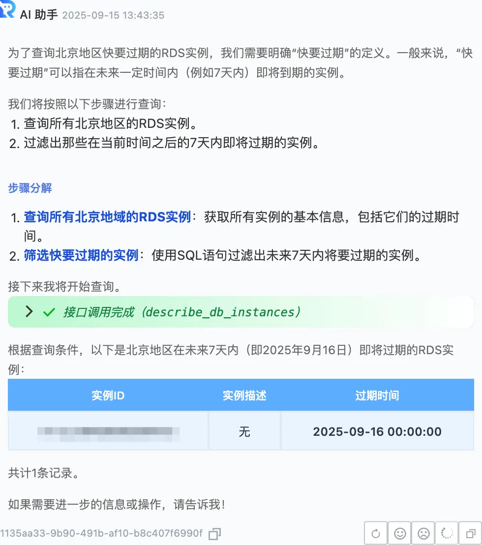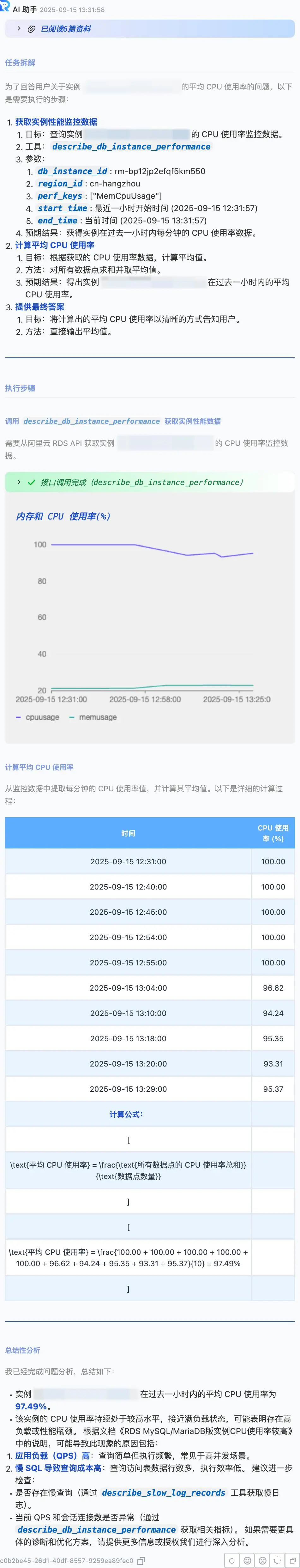 - 自然语言输入:用户以口语化方式提问,例如:“北京地域RDS MySQL实例的平均CPU使用率是多少?”或“列出所有未开启删除保护的生产实例。”
