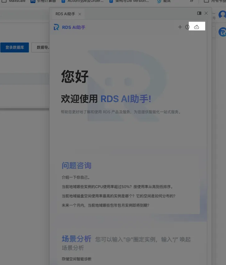 - 页面注入对话按钮:在数据库运维的热点页面埋入一键唤醒AI交互,将复杂的问题输入,变成简单的按钮点击。