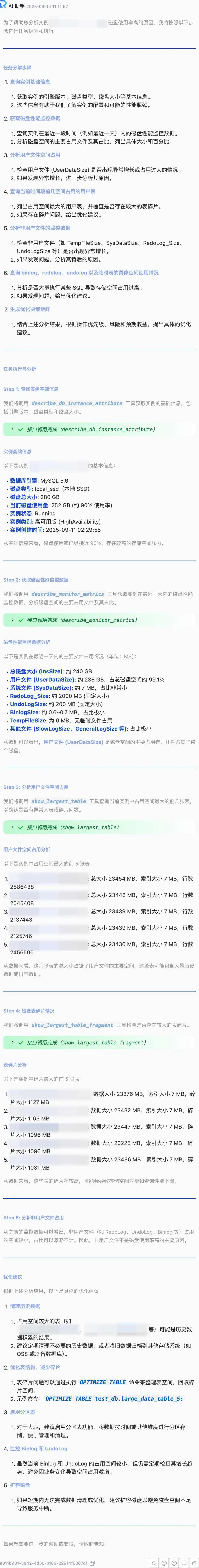 - 专项诊断与知识整合:根据问题类型调用相应的分析模块(如日志分析引擎、SQL诊断器、HA状态检查等),并结合产品知识库生成解答。