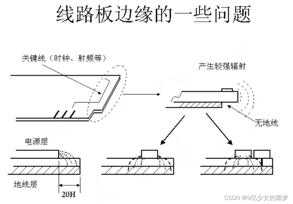 所有具有一定电压的印制板都会向空间辐射电磁能量,为减少这个效应,电源层比地层内缩 20H,H 为电源层与地层之间的距离,20H一般为3mm左右。