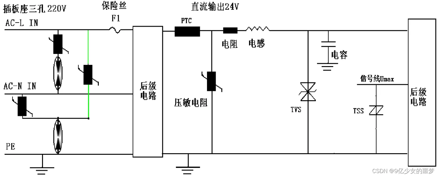 工作原理:当过电压出现在压敏电阻两端时,压敏电阻可将电压钳位到一个相对固定的电压值,从而保护后级电路。