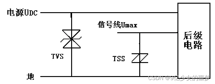 特点:响应时间ps级。通流量比TVS大,保护效果比TVS好。适合于信号电平较高的信号线保护。 选型注意:通流量优先选高的,信号线的工作电流要低于TSS的临界恢复电流,反向击穿电压一般按信号线1.2~1.5)*Umax设计。 Umax指信号线的最高电压。