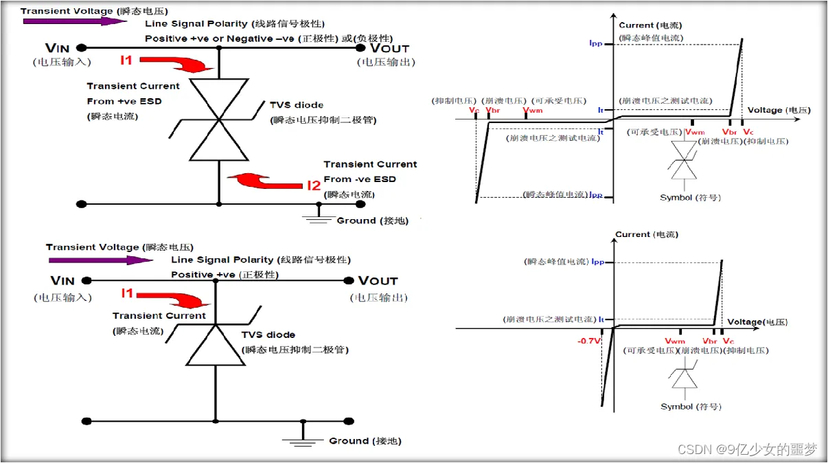 最小击穿电压 VBR :当瞬态电压超过Vbr,瞬态电压抑制二极管便产生崩溃把瞬态电压抑制在某个水平,提供瞬态电流一个超低电阻通路,让瞬态电流透过瞬态电压抑制二极管被引开,避开被保护元件;