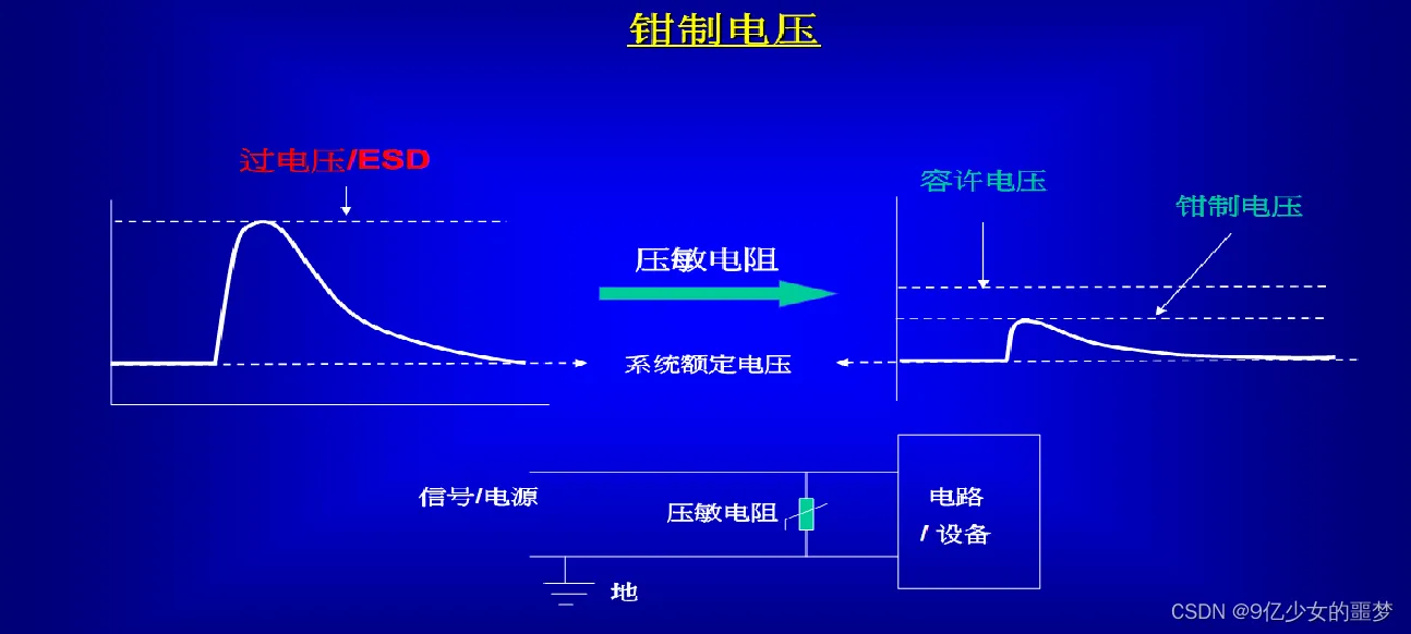最大限制电压Vc:Clamping Voltage 箝位电压,指压敏电阻两端所能承受的最大电压,此电压必须小于要保护的最大电压;