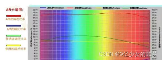 原理:当光从光疏物质射向光密物质时,反射光会有半波损失,在玻璃上镀 AR 膜后,表面的反射光比膜前表面反射光的光程差恰好相差半个波长,薄膜前后两个表面的反射光相消,即相当于增加了透射光的能量。并且可以通过在玻璃两面同时镀膜来让玻璃的两个面同时减小反射效果。